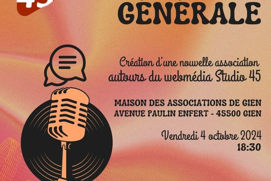Studio 45 organise ce vendredi 4 octobre 2024, à 18h30, à la Maison des Associations de Gien, une assemblée générale constitutive de la nouvelle association liée à notre webradio promouvant l'expression populaire et la découverte culturelle sur notre territoire. L'événement sera accompagné par un moment de convivialité et de festivité, avec un mini-concert de notre chroniqueur Joël Boureux.
